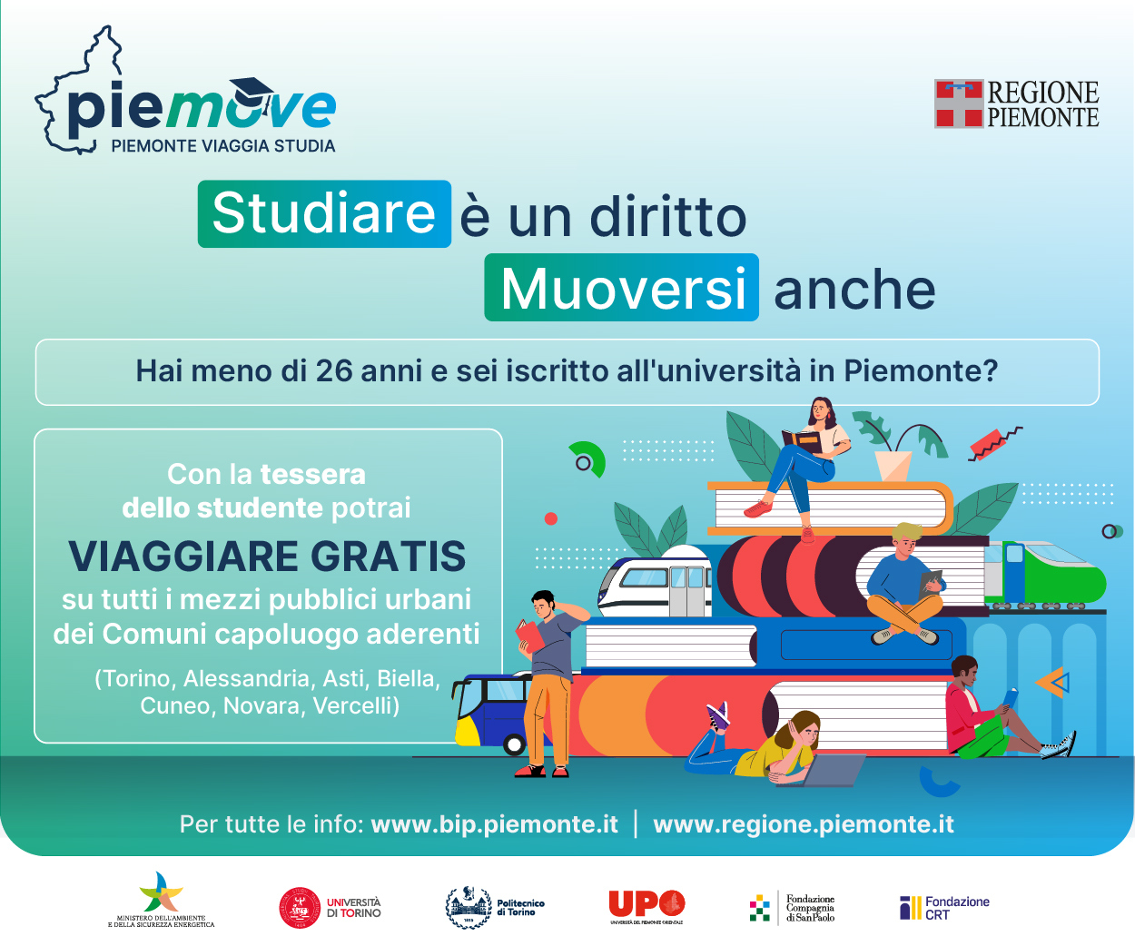 La Regione Piemonte lancia “Piemove - Piemonte Viaggia Studia”, una misura a sostegno della mobilità sostenibile e del diritto allo studio rivolta agli studenti universitari con meno di 26 anni che grazie al bonus potranno viaggiare gratuitamente sui mezzi del trasporto pubblico locale nei Comuni capoluogo aderenti (Torino, Alessandria, Asti, Biella, Cuneo, Novara, Verbania, Vercelli).